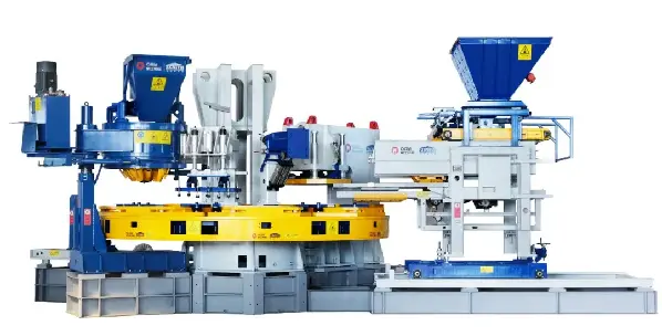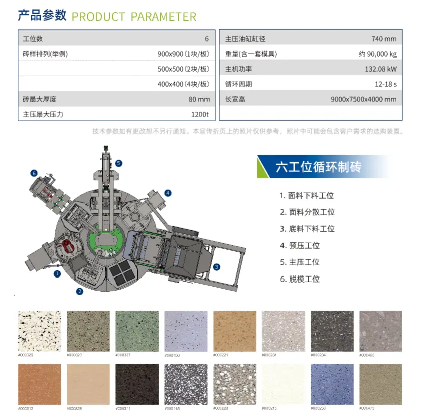 Главни притисак опреме усваја уређај за пуњење прелазног резервоара за уље великог пречника, који може брзо да реагује, осетљиво се креће и може да произведе 1.200 тона притиска. Хидраулична станица има варијабилну пумпу, која подешава брзину и притисак кроз пропорционални вентил, који штеди енергију и једноставан за руковање. Грамофон има ултра-велики окретни лежај, који се контролише серво мотором са енкодером и има стабилан рад и прецизну контролу. Истовремено, усваја напредни систем визуелне контроле, а ПЛЦ усваја серију Сиеменс С7-1500. Уређај за истовар материјала има уграђен уређај за мешање, а за истовар се користи квантитативни окретни тањир, а количина материјала је тачна и стабилна.