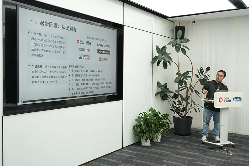 У конференцијској сали, особље из Одељења за опрему Општинског бироа за индустрију и информационе технологије Кванџоуа објаснило је основну ситуацију, историју развоја и будуће изгледе индустрије производње опреме у Кванџоуу; приказан је и промотивни видео компаније Куанзхоу Мацхинери Индустри Цо., Лтд.